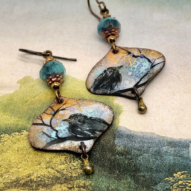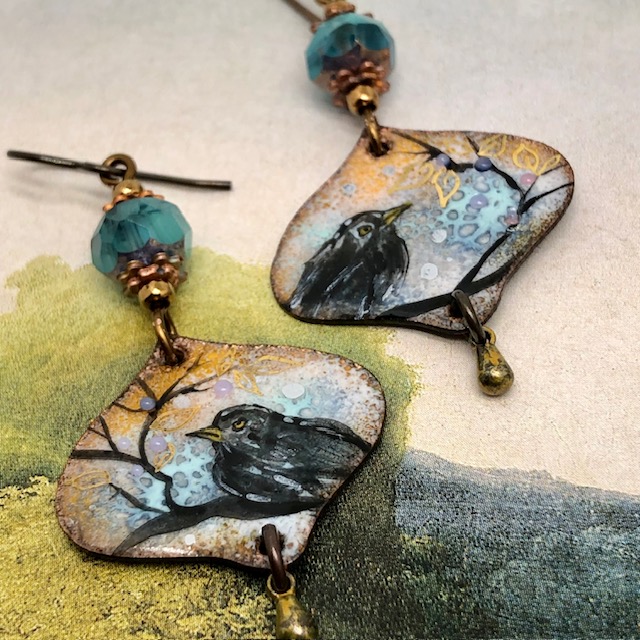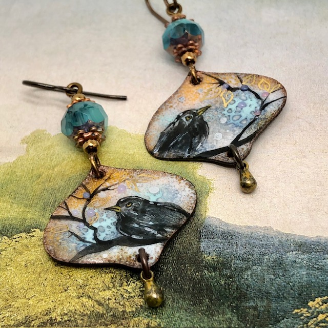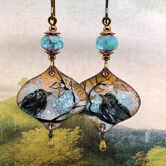 Ces boucles d’oreilles sont composées de superbes pendentifs en cuivre émaillé, peints à la main, qui représentent un oiseau noir posé sur une branche dans un paysage automnal. J’ai associé à ces pendentifs artisanaux de superbes perles en verre tchèque vert turquoise. Celles-ci sont flanquées de coupelles florales en cuivre et de perles de rocaille japonaises bronze. De petites gouttes en laiton bronze doré terminent cette composition.