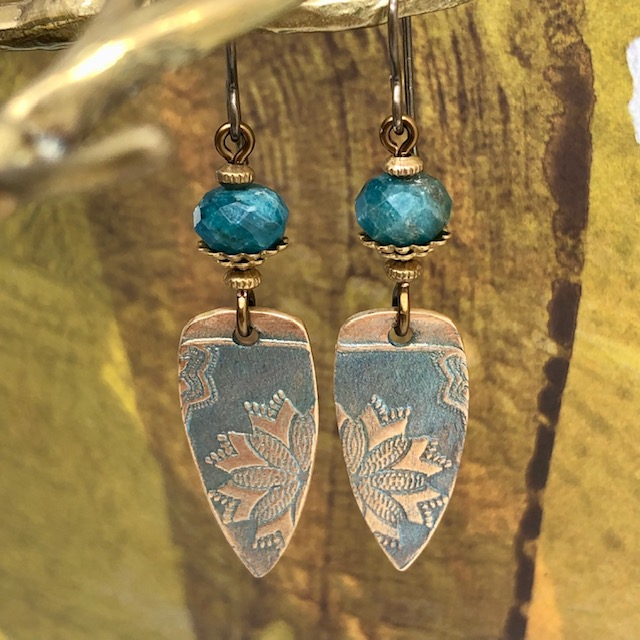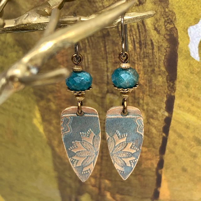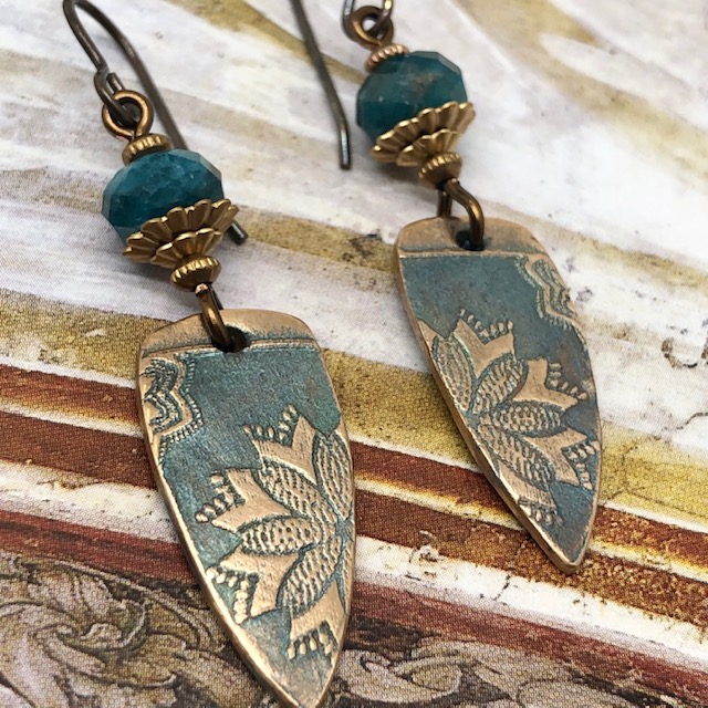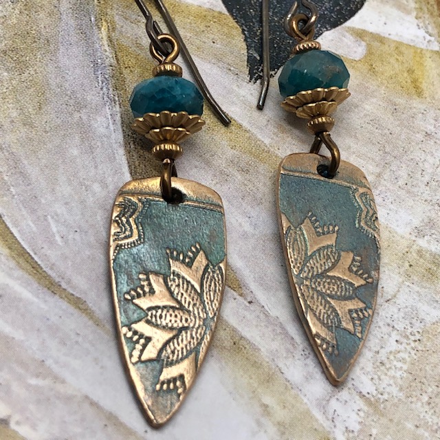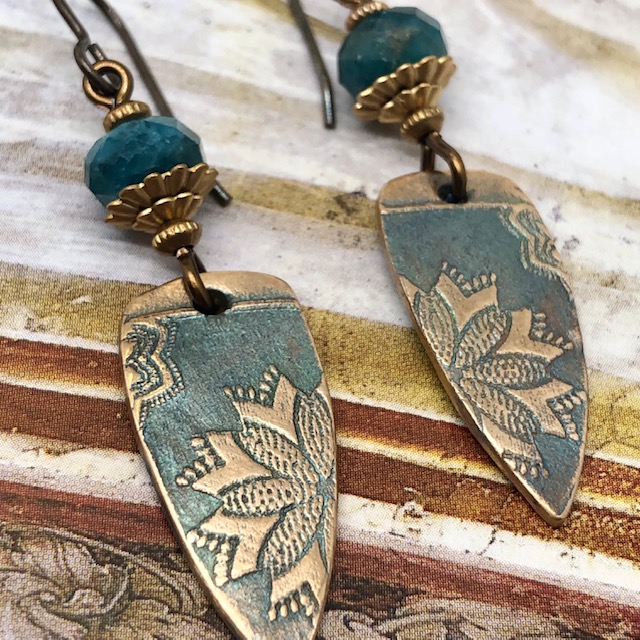 Ces boucles d’oreilles sont composées de superbes pendentifs artisanaux en bronze avec un motif de fleur or sur un fond vert émeraude.