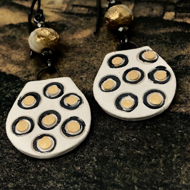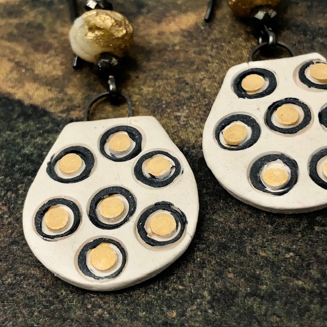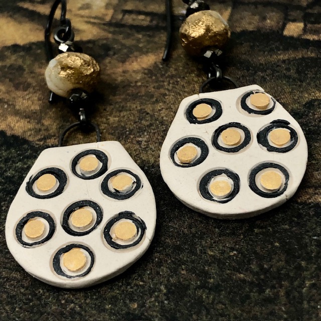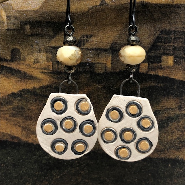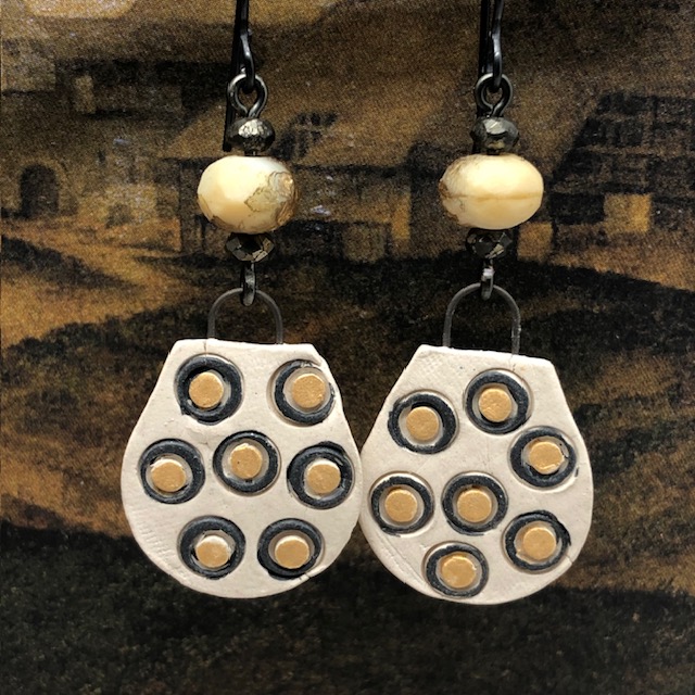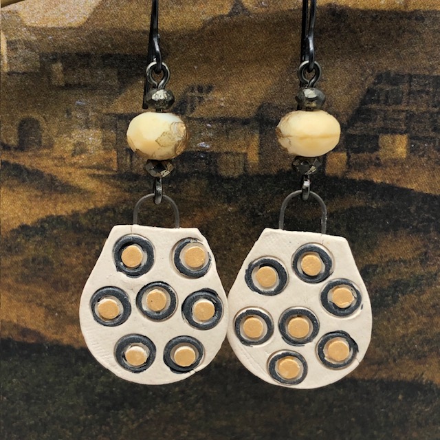 Ces boucles d’oreilles asymétriques sont composées de ravissants pendentifs en céramique avec un motif de petites bulles en relief jaunes, cerclées de noir, sur un fond beige pâle. J’ai ajouté, au-dessus de ces petits pendentifs artisanaux de jolies perles tchèques jaune et or avec une texture un peu rugueuse. De petites perles en pyrite terminent cette création.