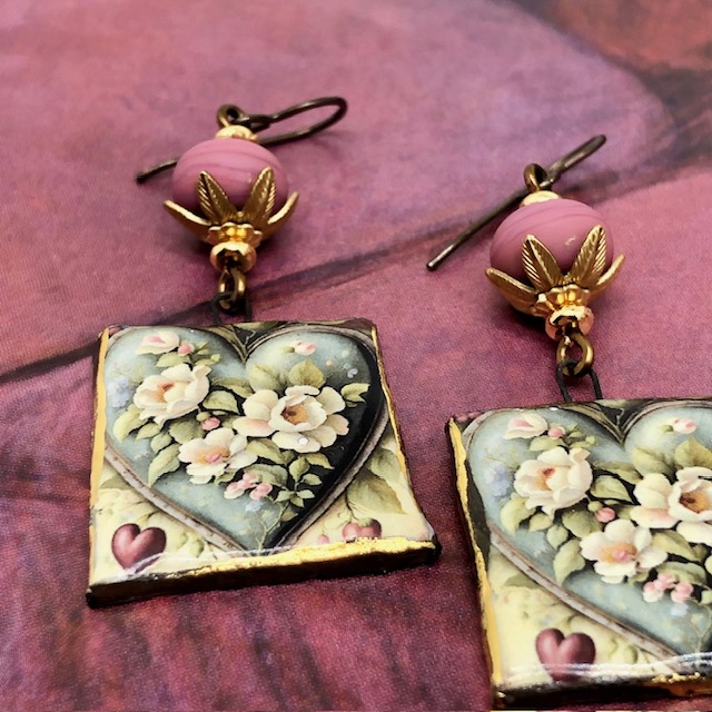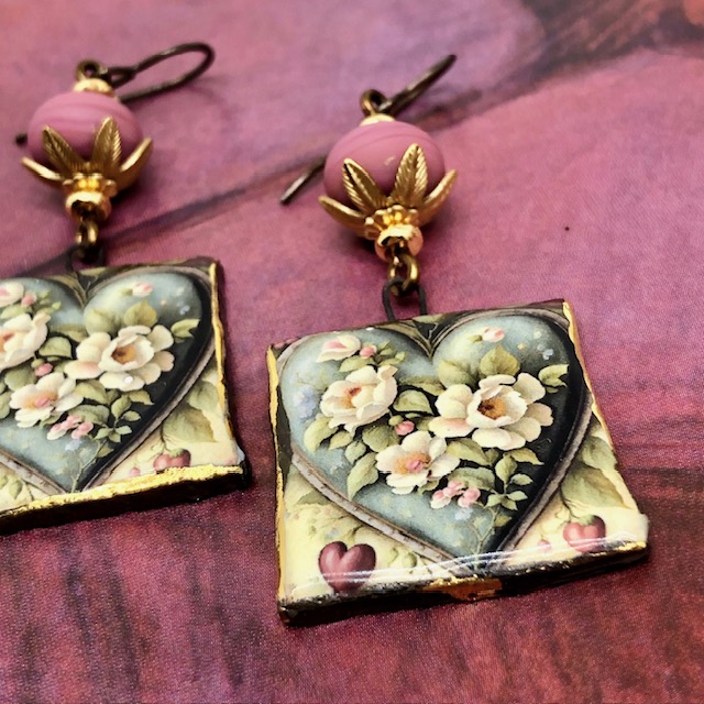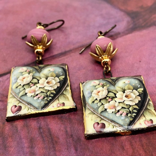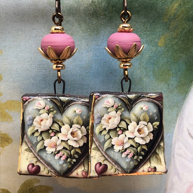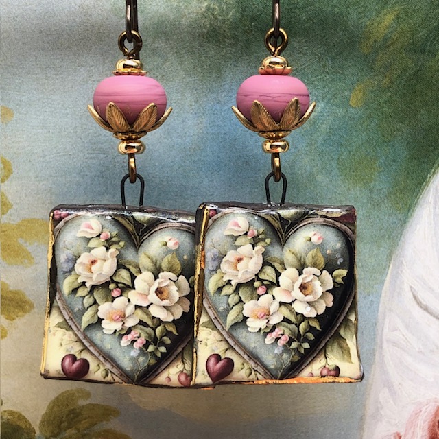 Ces boucles d’oreilles se composent de ravissants pendentifs en céramique avec un motif de coeur de fleurs blanches sur un fond vert kaki. J’ai ajouté au-dessus de ces pendentifs artisanaux de magnifiques perles en verre filé à la flamme rose fanée avec un aspect mat. Ces perles sont flanquées de coupelles florales en laiton doré et de perles de rocaille Miyuki.