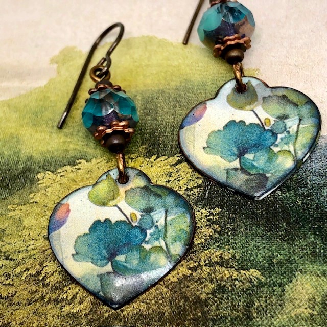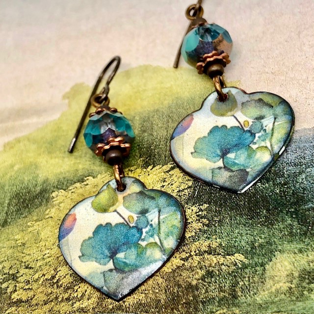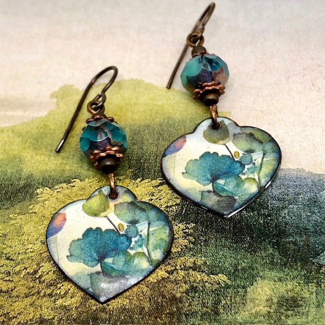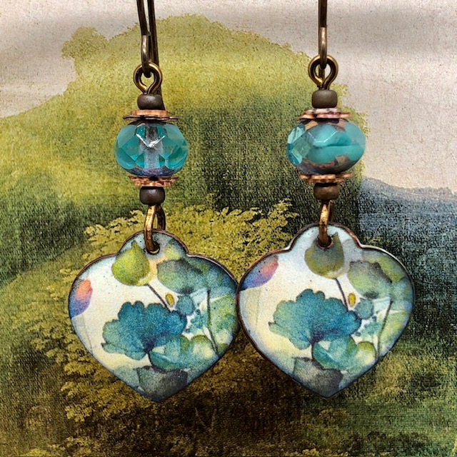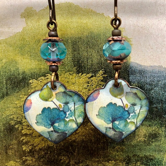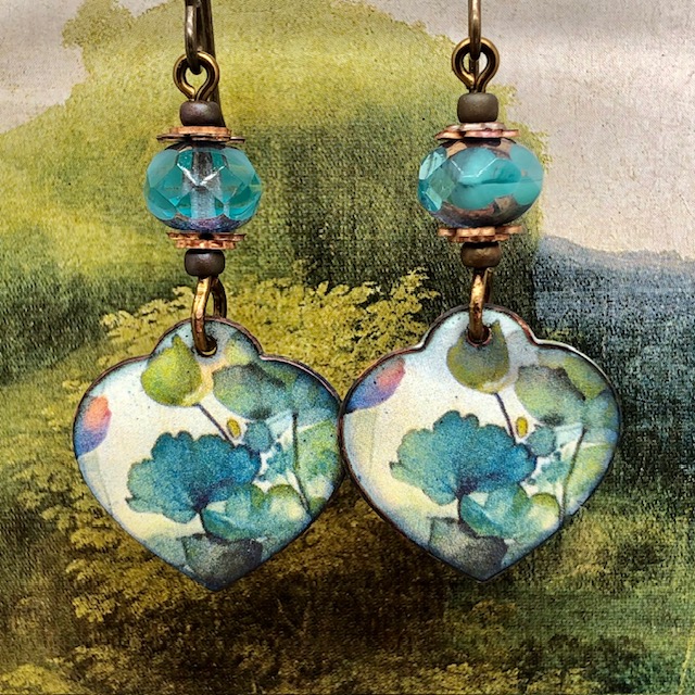 Ces boucles d’oreilles se composent de ravissants pendentifs en cuivre émaillé en forme de coeur avec un motif de fleurs turquoise et verte clair sur un fond blanc cassé. J’ai ajouté au-dessus de ces pendentifs artisanaux, de jolies perles en verre de Bohême turquoise mat et transparentes. Ces perles sont flanquées de coupelles florales en cuivre vieilli et de perles de rocaille Miyuki.