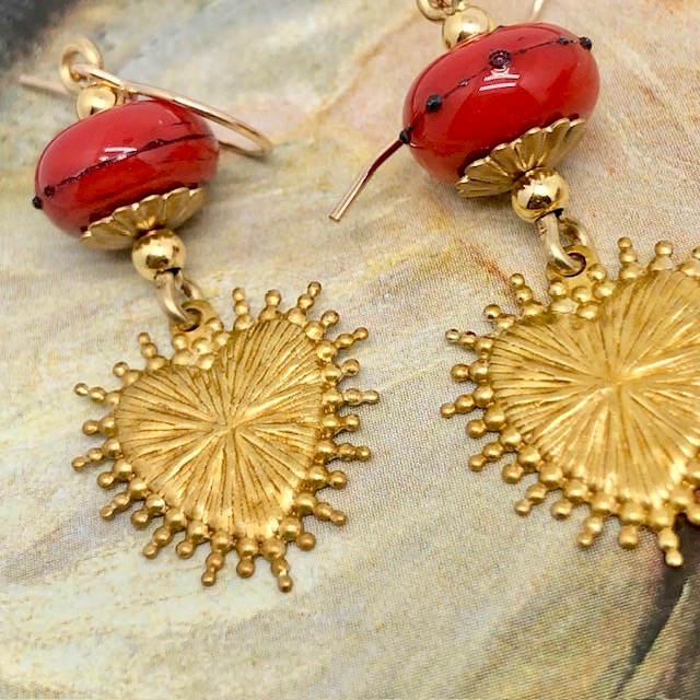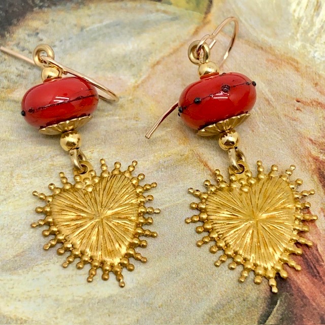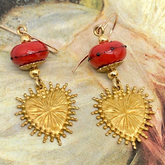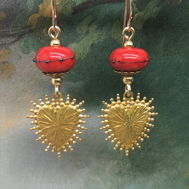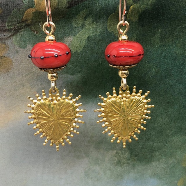 Ces boucles d’oreilles sont composées de ravissants pendentifs ex-votos en laiton doré en forme de coeur, auxquels j’ai associé de superbes perles en verre filé à la flamme rouge vermillon. Les ex-votos sont des objets de décoration mural. Traditionnellement, ils étaient accrochés dans des lieux de cultes, une église, un lieu vénéré, à la suite d’un vœu ou en remerciement d’une grâce obtenue. Souvent ce sont des cœurs, avec des symboles issues de la culture mexicaine.