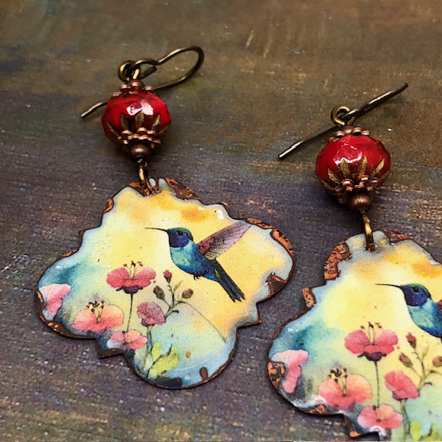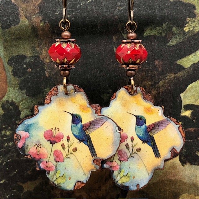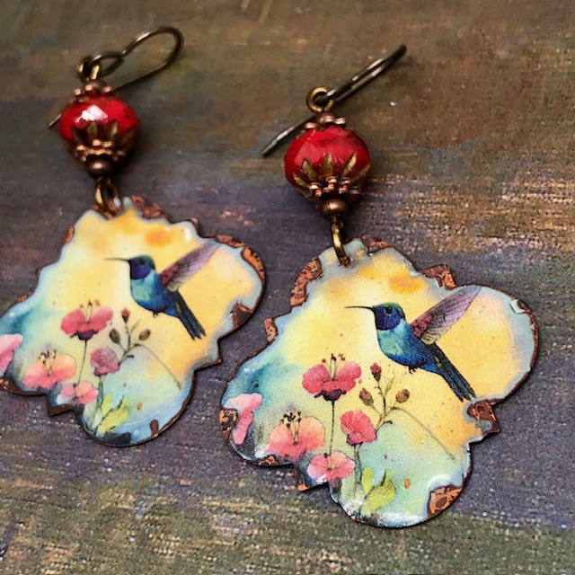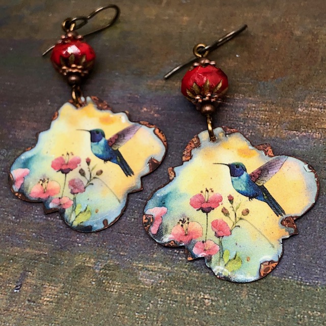 Ces grandes boucles d’oreilles sont composées de magnifiques pendentifs en cuivre émaillé avec une forme irrégulière et représentent un colibri voletant parmi des fleurs sur un fond jaune. Le colibri est le plus petit oiseau au monde et vit uniquement sur le continent américain. Il se nourrit surtout du nectar des fleurs et peut visiter jusqu’à 1000 fleurs par jour.