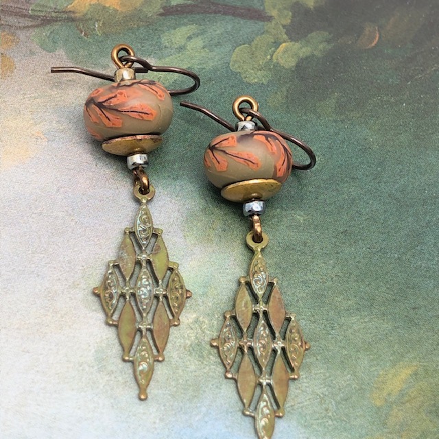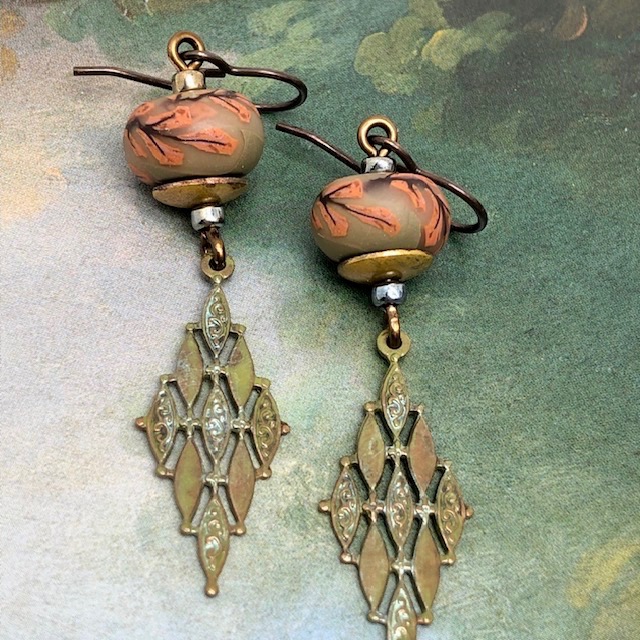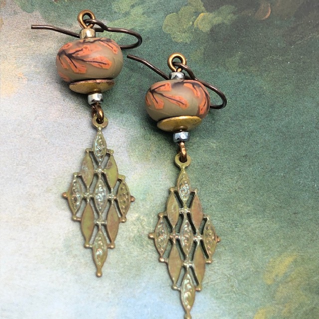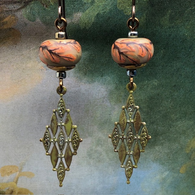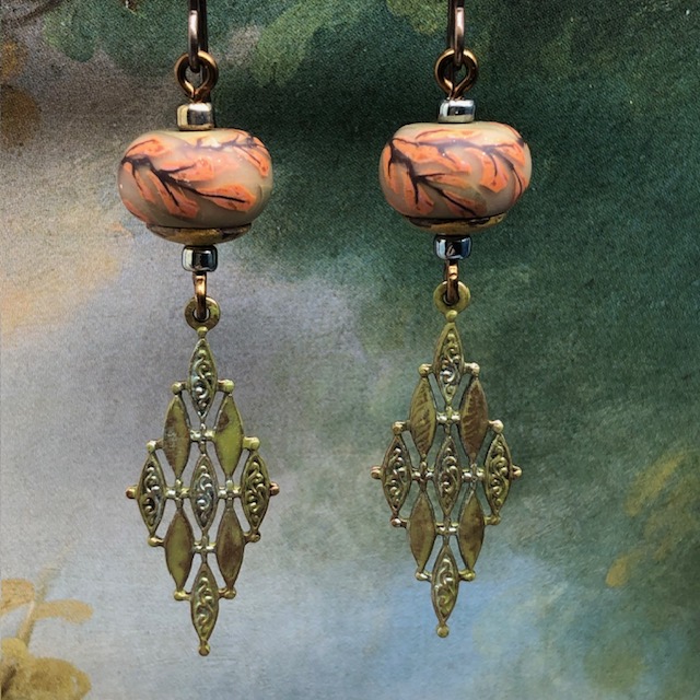 Ces longues boucles d’oreilles sont composées de superbes perles en argile polymère avec un motif de branche d’arbre rose corail sur un fond kaki clair. J’ai associé à ces perles artisanales de magnifiques pendentifs en laiton avec une forme de losange que j’ai patinés en vert kaki. Des coupelles en laiton et des perles de rocaille japonaises terminent cette composition.
