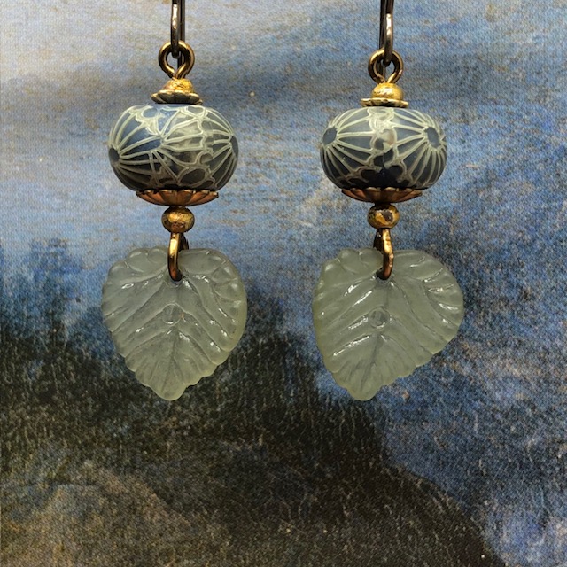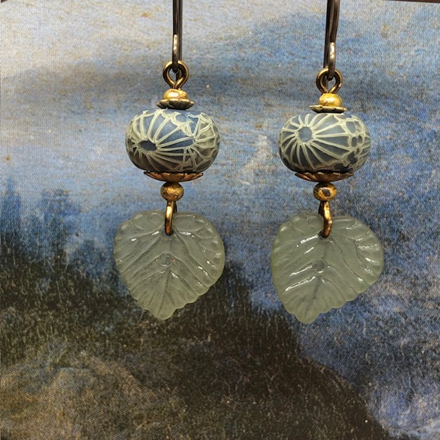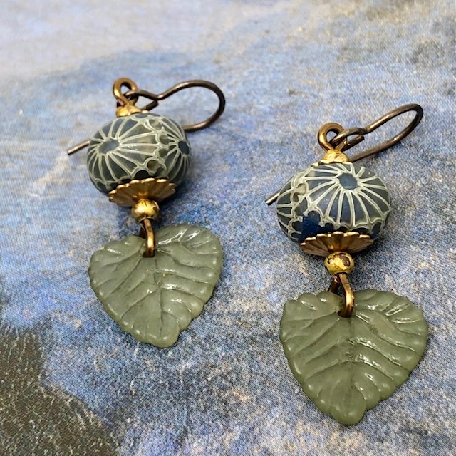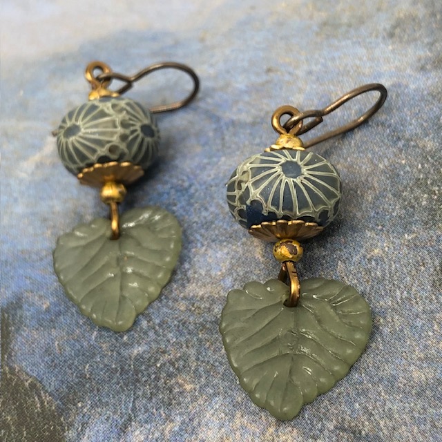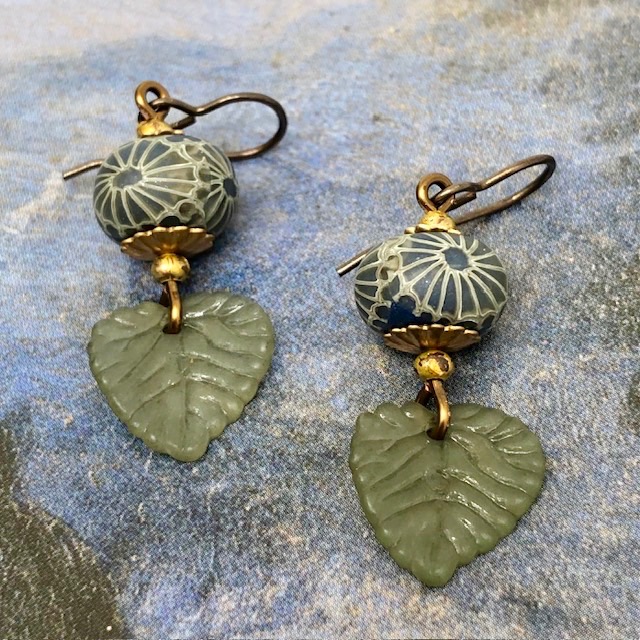 Ces petites boucles d’oreilles sont composées de jolies feuilles en acrylique kaki clair auxquelles j’ai associé de superbes perles artisanales en argile polymère avec un motif kaki et bleu paon. Ces perles sont flanquées de coupelles florales et de perles rondes en laiton brut.