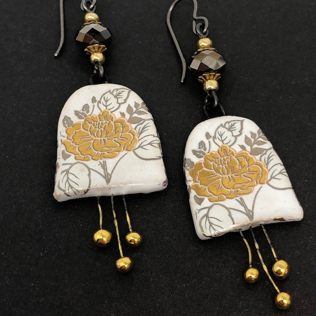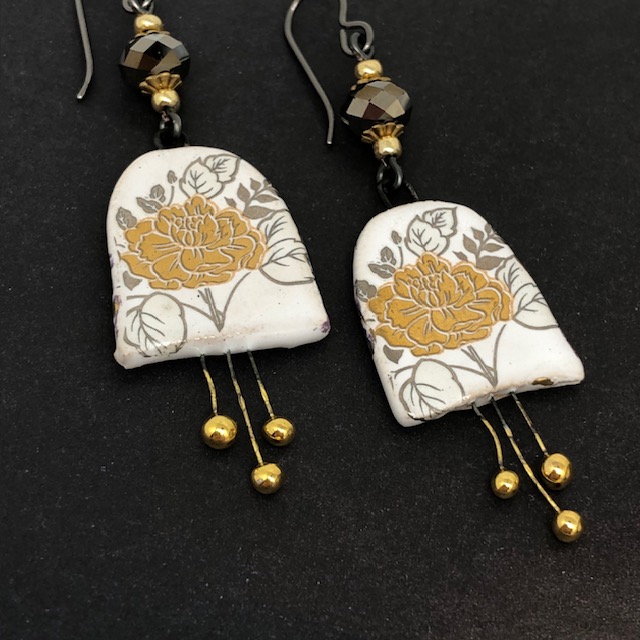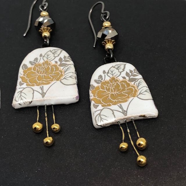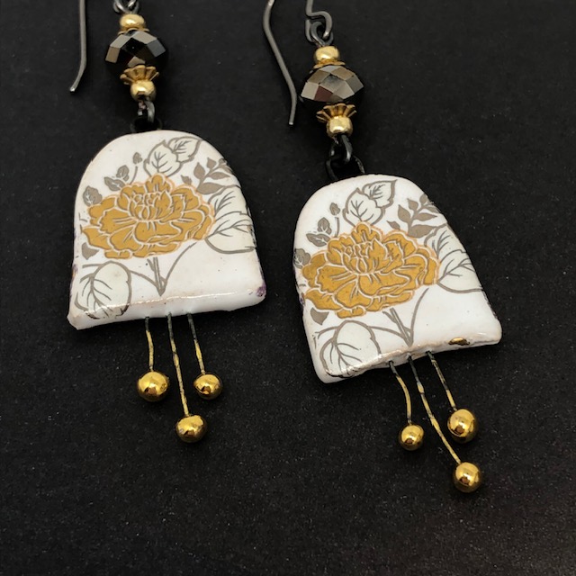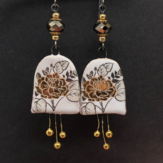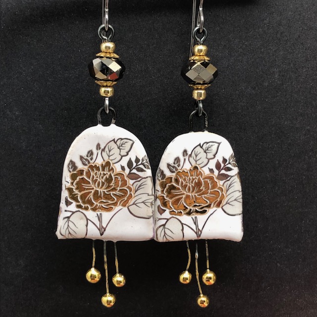 Ces longues boucles d’oreilles sont composées de ravissants pendentifs en céramique avec un motif de fleurs dorées au feuillage argenté sur un fond blanc. J’ai ajouté au-dessus de ces pendentifs artisanaux de jolies perles facettées en cristal Swarovski bronze argenté. Des coupelles florales en laiton doré et des perles de rocaille japonaises terminent cette composition.