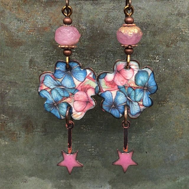 Ces longues boucles d’oreilles asymétriques se composent de superbes pendentifs en cuivre émaillé en forme de fleur et qui représentent des fleurs rose et bleu. J’ai ajouté au-dessus de ces pendentifs artisanaux de magnifiques perles en verre tchèque rose pastel et or, flanquées de coupelles florales en cuivre. De jolies étoiles en cuivre rose clair terminent cette création.