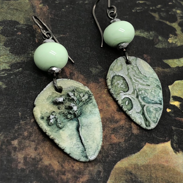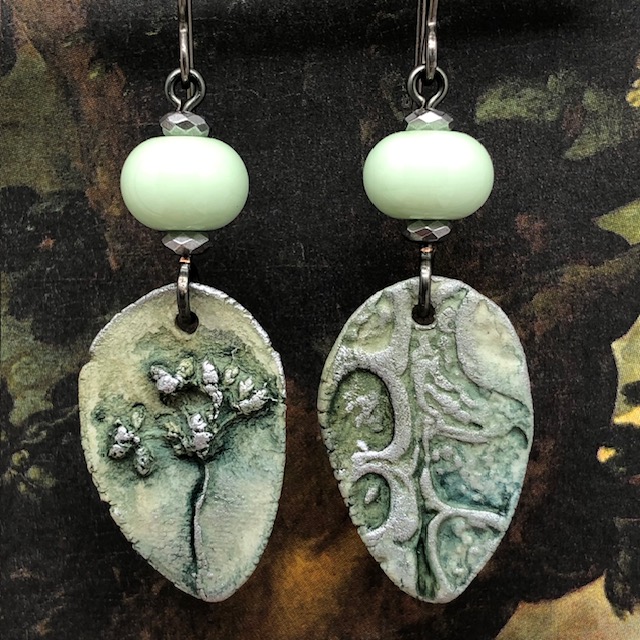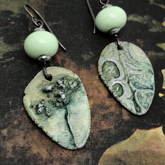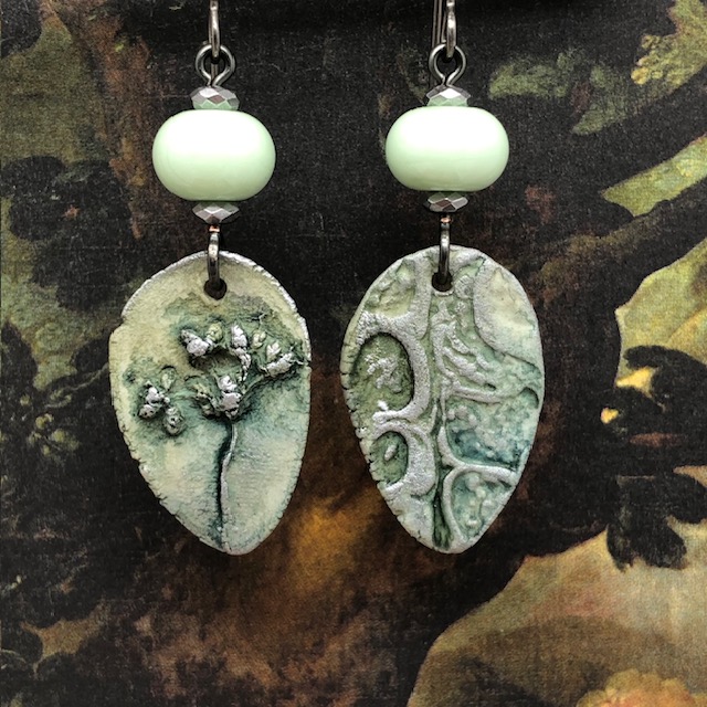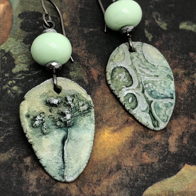 Ces boucles d’oreilles asymétriques sont composées de splendides pendentifs en céramique dans un camaïeu de vert avec une forme de feuille d’arbre et un motif en relief. J’ai associé à ces pendentifs artisanaux de superbes perles en verre filé à la flamme vert pâle, flanquées de petites perles facettées en verre.