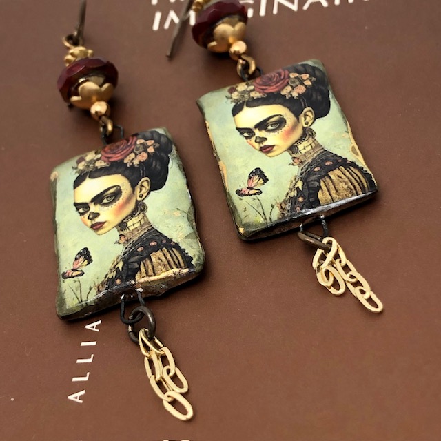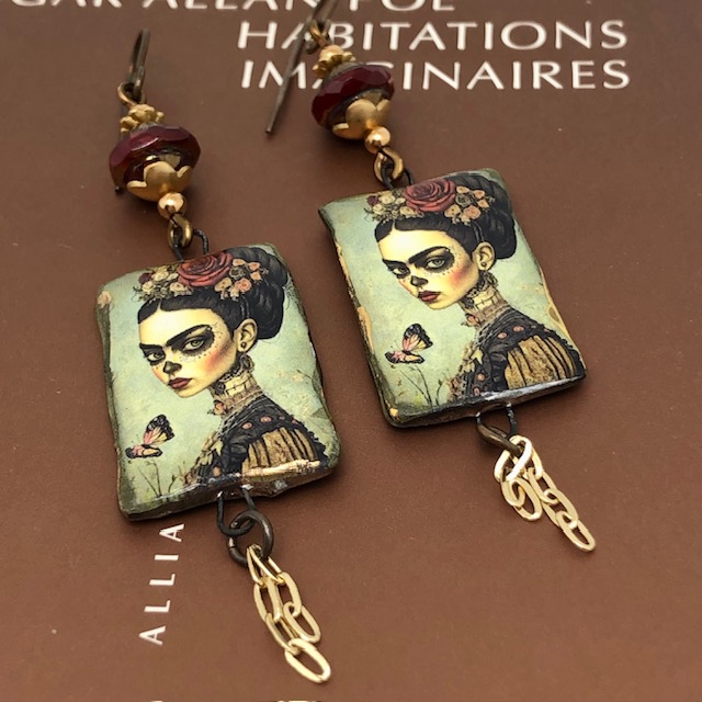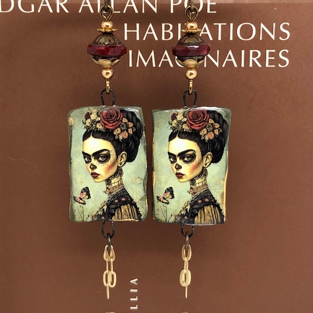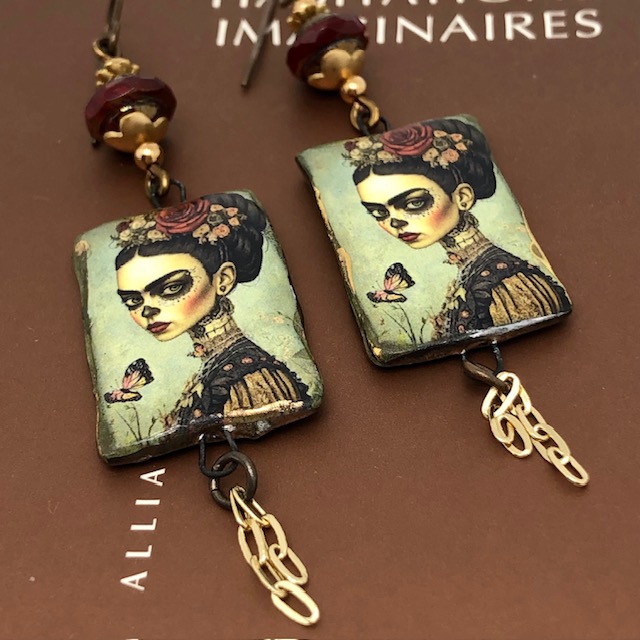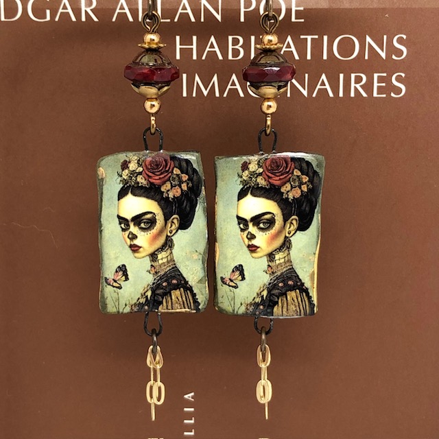 Ces longues boucles d’oreilles sont composées de superbes pendentifs en céramique avec un portrait hommage de la célèbre artiste peintre mexicaine Frida Kahlo (1907-1954) déguisée pour le « Dia de los Muertos » (Jour des morts) au Mexique. Contrairement à ce que l’on pourrait croire, le Día de los Muertos, ou le Jour des Morts, n’est pas une version mexicaine d’Halloween.