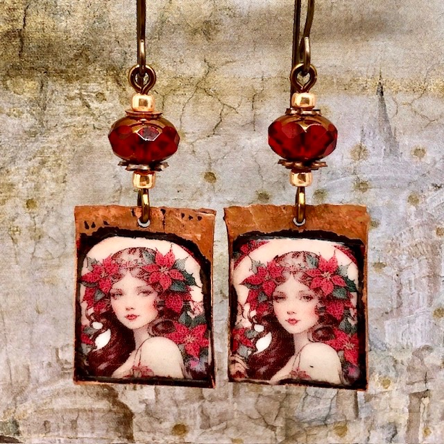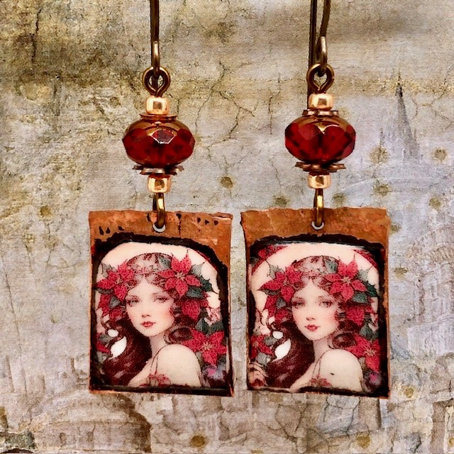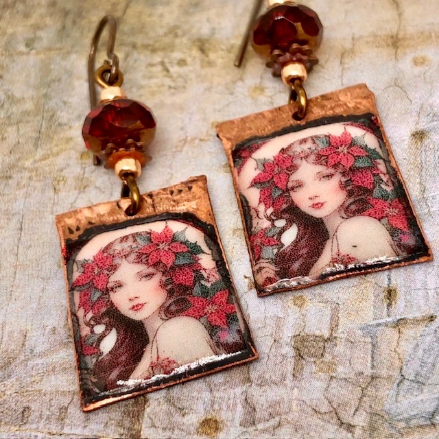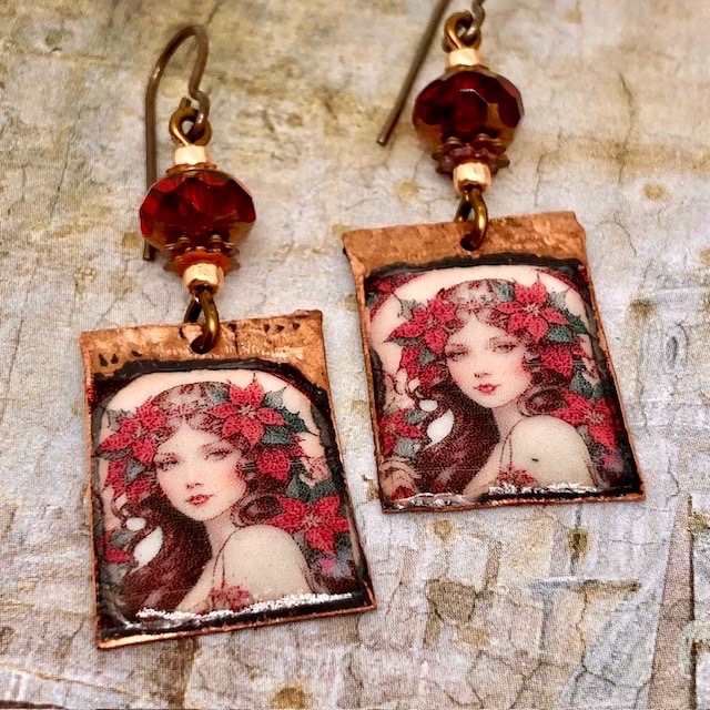 Ces boucles d’oreilles se composent de superbes pendentifs en cuivre émaillé qui représentent le portrait d’une femme à la chevelure piquée de fleurs rouges. Ce portrait me fait penser aux illustrations de Mucha avec une touche de modernité.