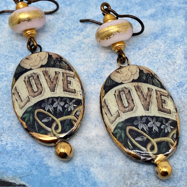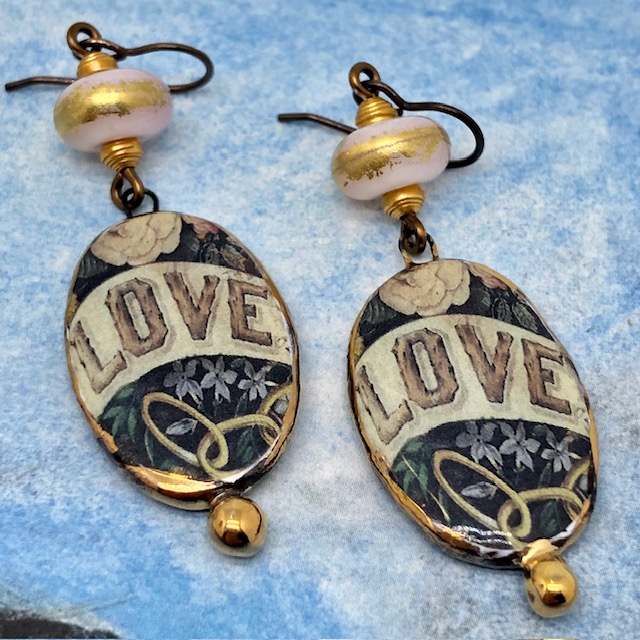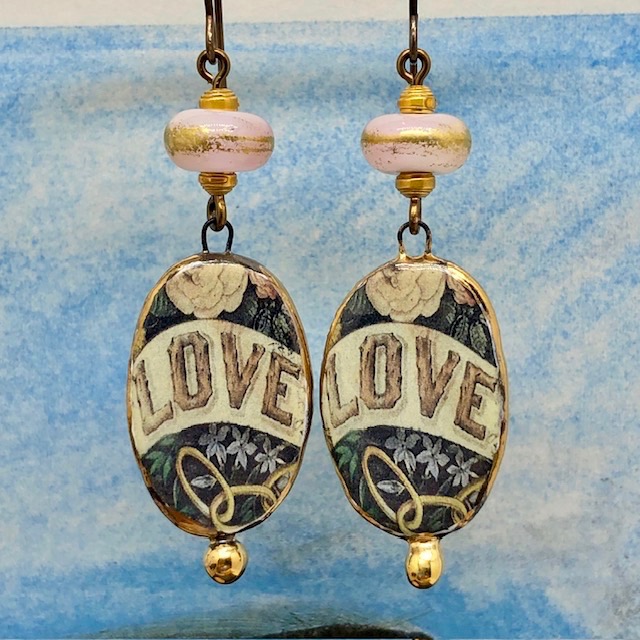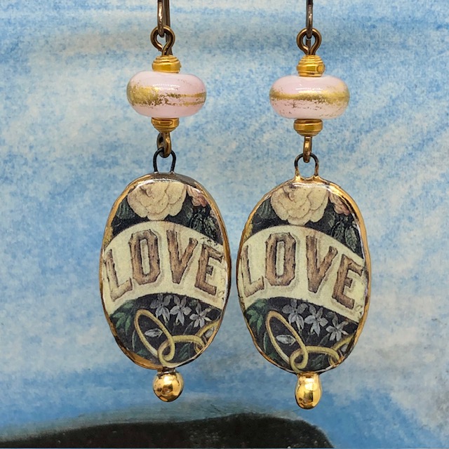 Ces longues boucles d’oreilles sont composées de ravissants pendentifs en céramique ovales avec le mot « LOVE » écrit sur un fond bleu marine piqué de fleurs blanc cassé et bleu clair. Le contour des pendentifs est doré, ce qui ajoute une touche d’éclat à ces boucles d’oreilles.