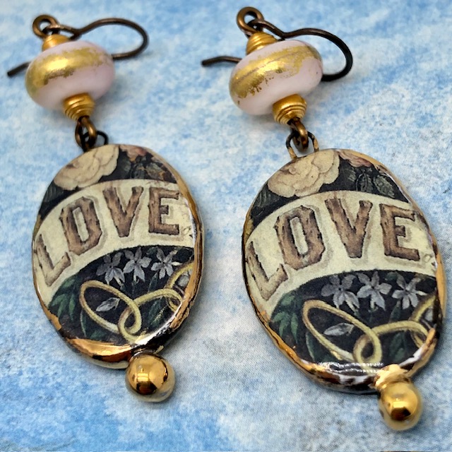 Au-dessus de ces pendentifs artisanaux, j’ai ajouté de superbes perles en verre filé à la flamme rose fanée et cerclé d’or. Celles-ci sont flanquées de perles coniques en vermeil Thaï Karen.