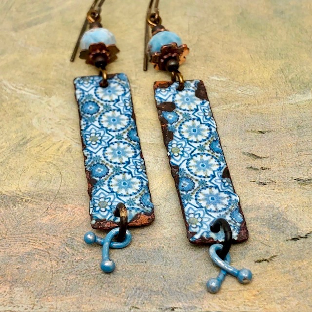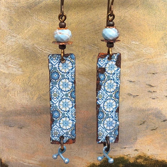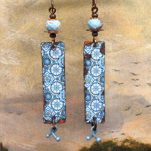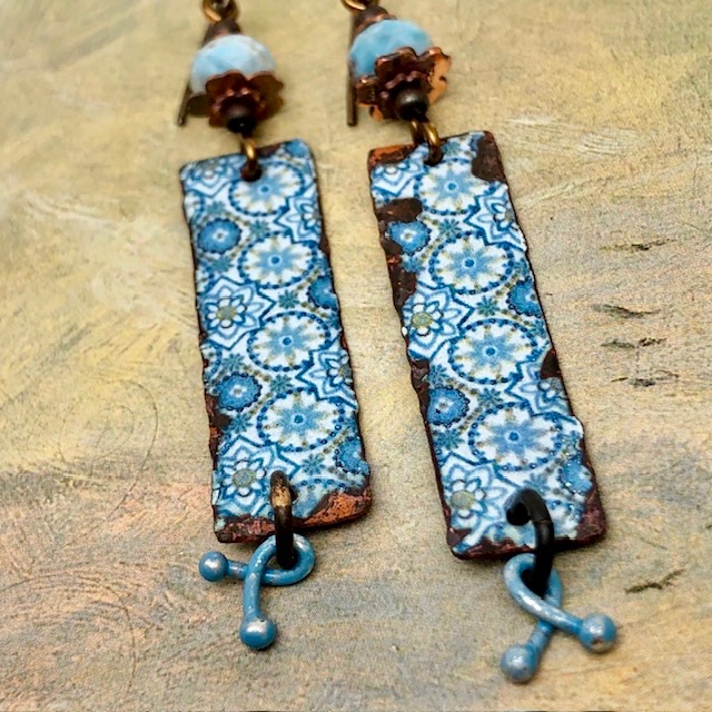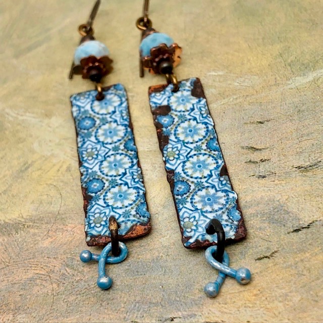 Ces longues boucles d’oreilles sont composées de magnifiques pendentifs en cuivre émaillé avec un motif de mandala bleu ciel. J’ai ajouté au-dessus de ces pendentifs artisanaux de superbes perles facettées en apatite bleue. Celles-ci sont flanquées de coupelles florales en cuivre et des perles de rocailles japonaises. De petites breloques patinées en bleu ciel terminent cette création.