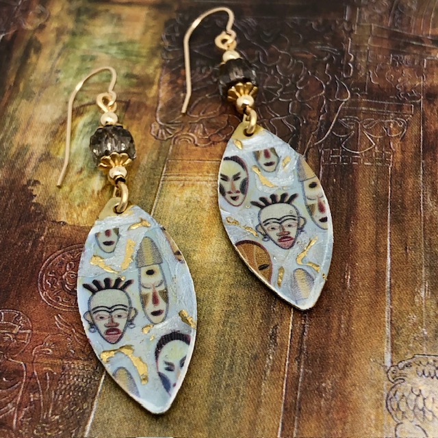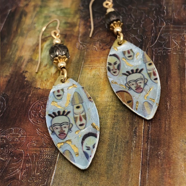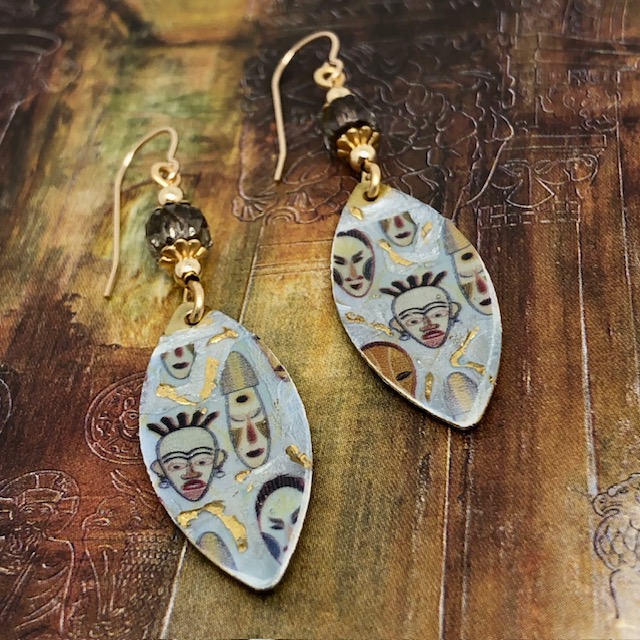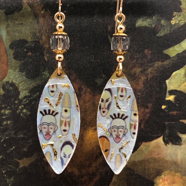 Ces boucles d’oreilles asymétriques sont composées de magnifiques pendentifs en laiton émaillé en forme de navette et représentent des masques africains sur un fond blanc cassé avec des coulées d’or. J’ai ajouté au-dessus de ces pendentifs artisanaux de jolies perles en verre de Bohême transparentes avec une bordure dorée. Des coupelles florales et des perles en laiton dorées terminent cette création.