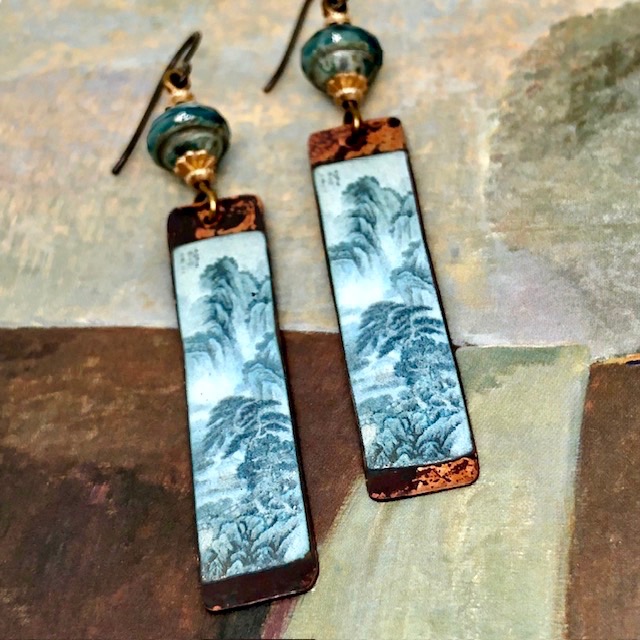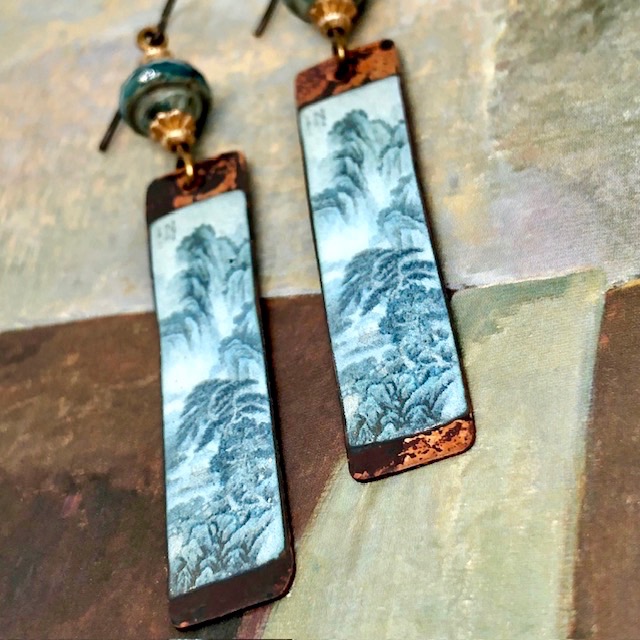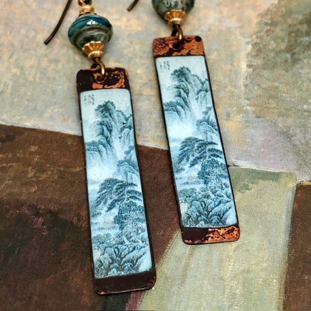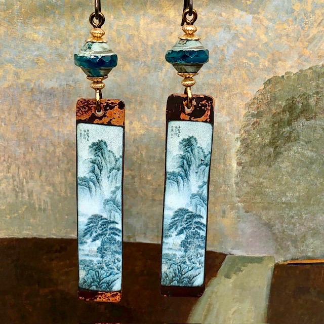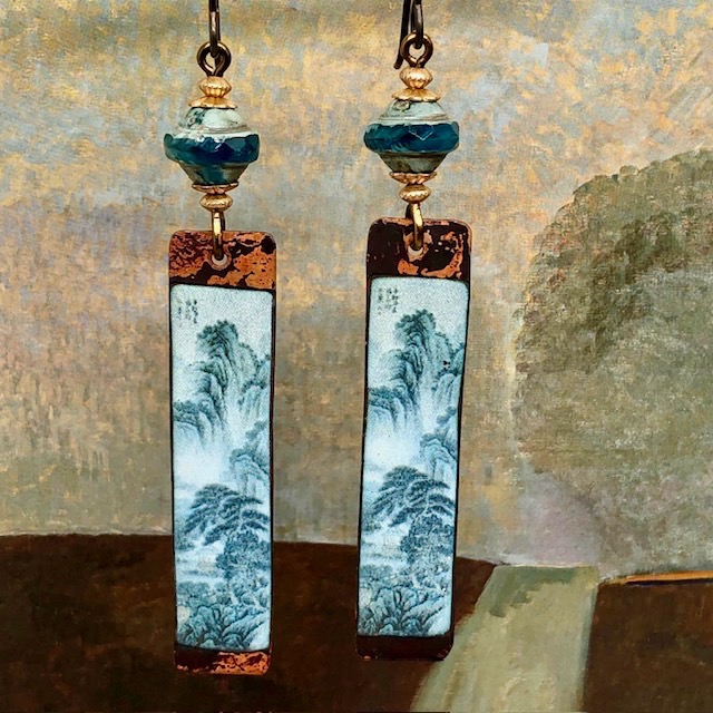 Ces longues boucles d’oreilles sont composées de ravissants pendentifs en cuivre émaillé qui représentent une montagne japonaise dans des tons de bleu turquoise. Au-dessus de ces pendentifs artisanaux, j’ai ajouté de superbes perles en verre de Bohême bleu turquoise également. Celles-ci sont flanquées de coupelles en laiton doré.
