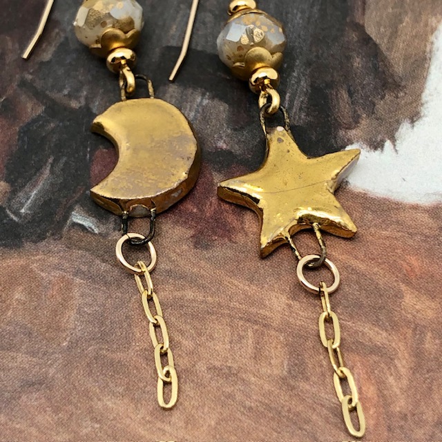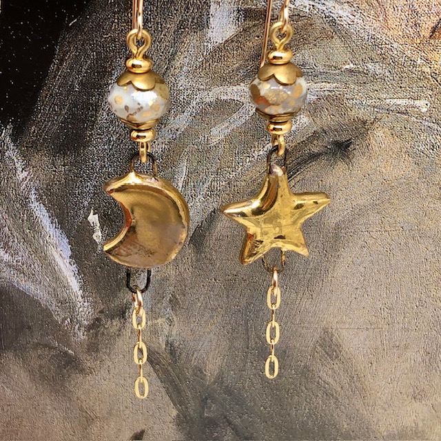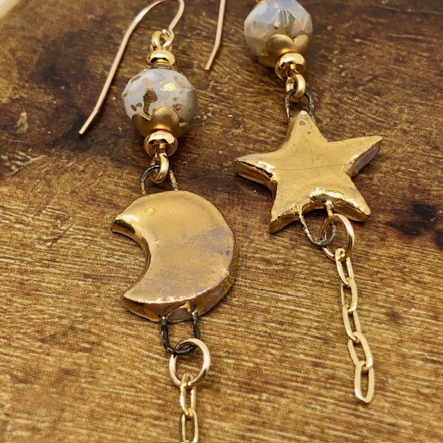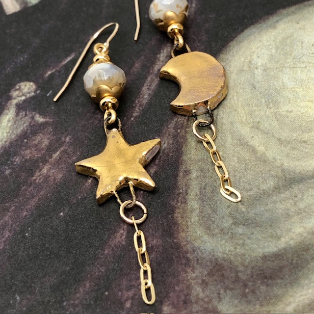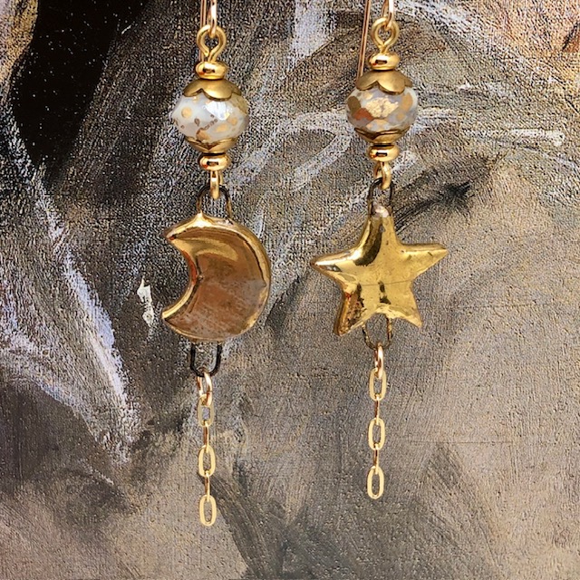 Ces longues boucles d’oreilles asymétriques sont composées de superbes pendentifs artisanaux en céramique. La première boucle d’oreilles est constituée d’un petit pendentif en forme de croissant de lune doré. La seconde, d’un petit pendentif en forme d’étoile dorée. Au-dessous de ces pendentifs artisanaux, j’ai ajouté de superbes perles en verre de Bohême blanc et or, flanquées de coupelles en laiton doré.