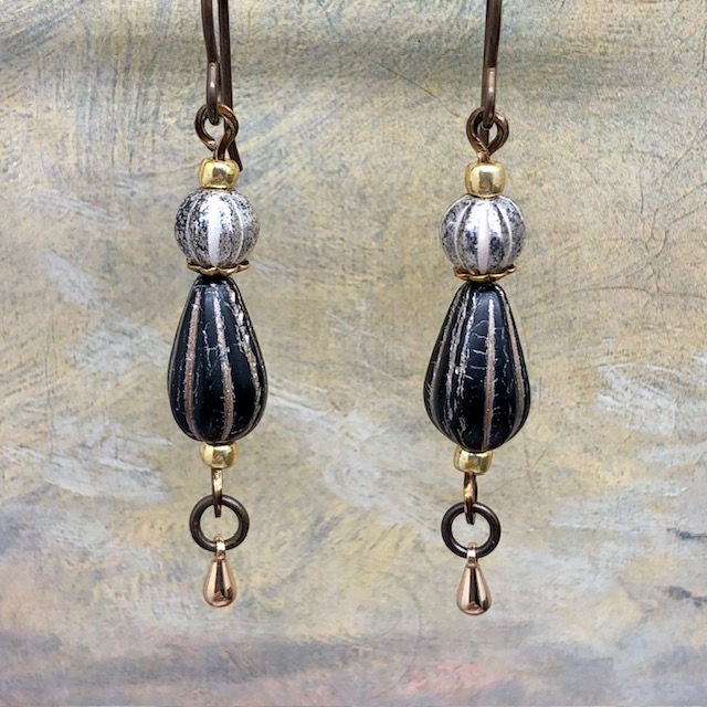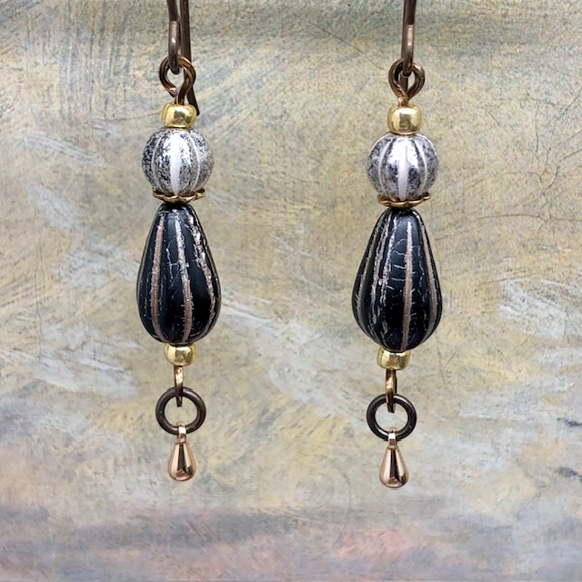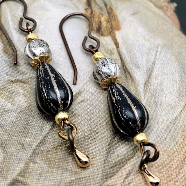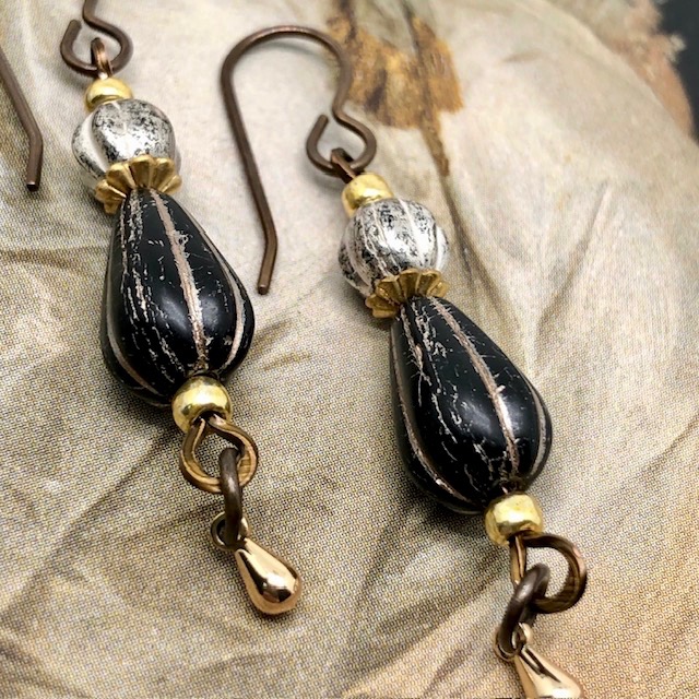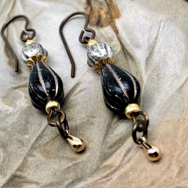 Ces boucles d’oreilles sont composées de très jolies perles en verre de Bohême de forme et de taille différentes, noir et or, argent oxydé. Je leur ai associé de petites perles plates, des coupelles et des breloques dorées.