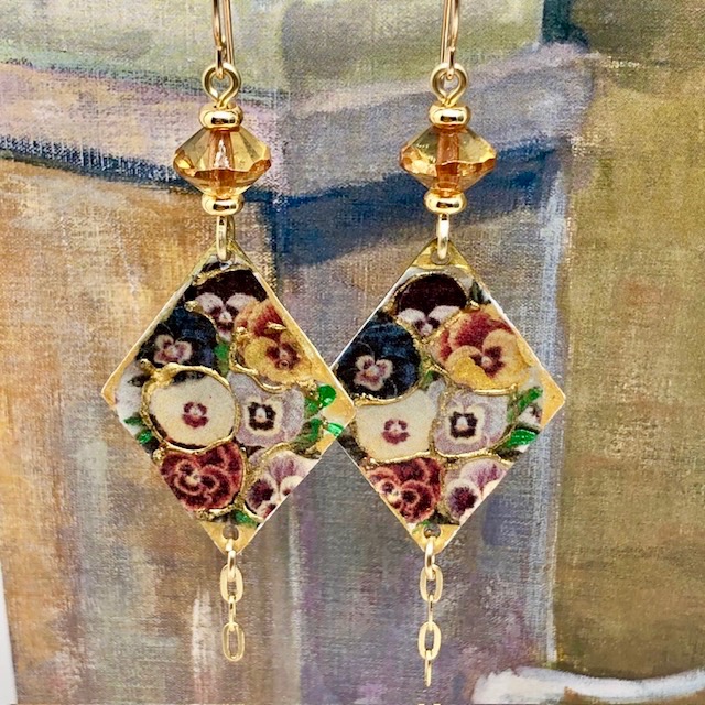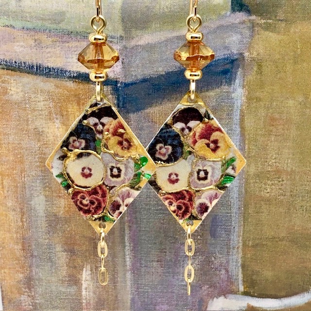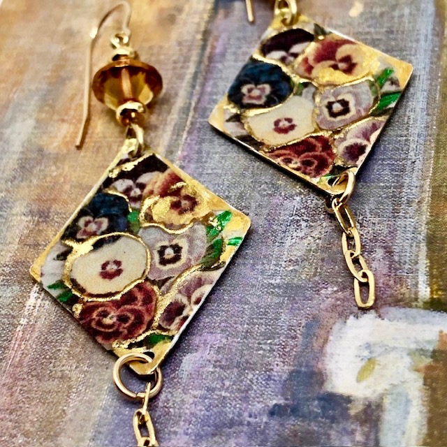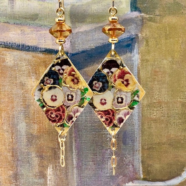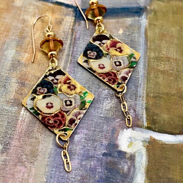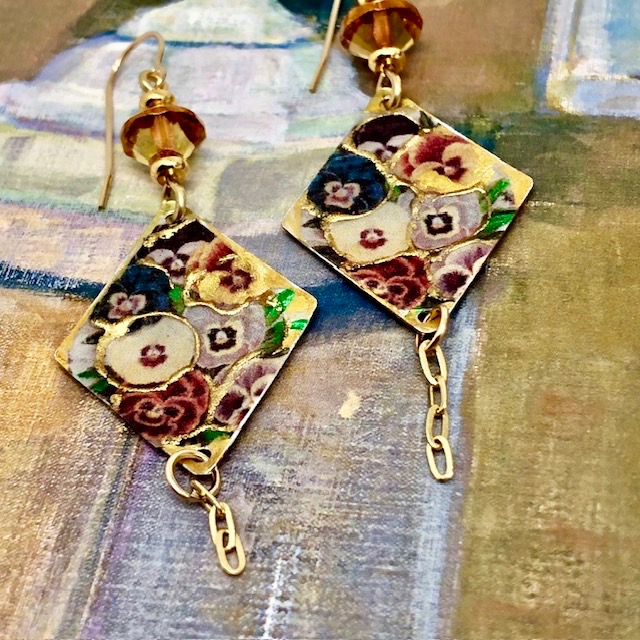 Ces boucles d’oreilles se composent de superbes pendentifs en cuivre émaillé, peints à la main, avec une forme de losange et qui représentent des pensées aux couleurs automnales entremêlées de lignes d’un bel or chaud. J’ai ajouté au-dessus de ces pendentifs artisanaux de jolies perles en verre de Bohême ambre, flanquées de perles en métal plaqué or. Des petites chaînettes en plaqué or terminent cette création et donnent un joli mouvement à l’ensemble.