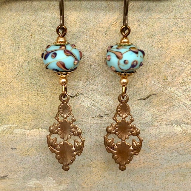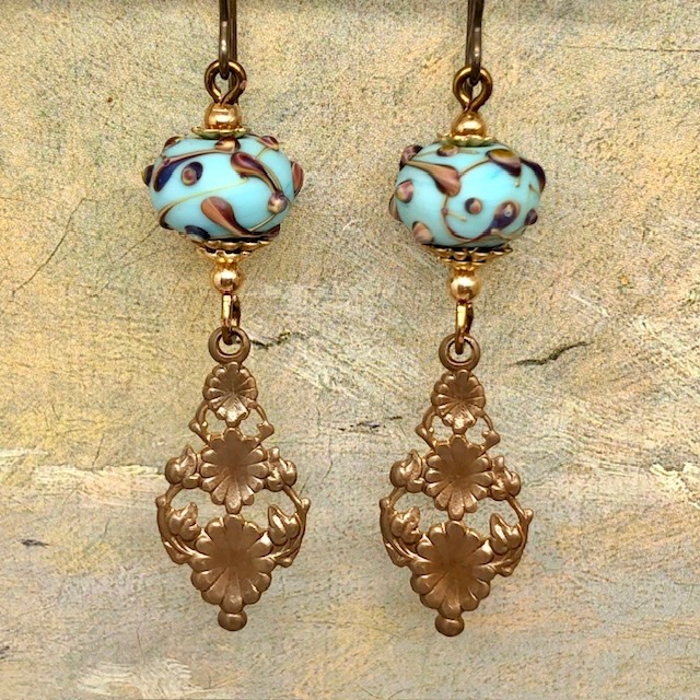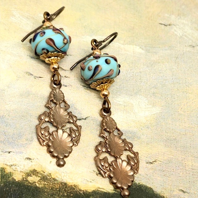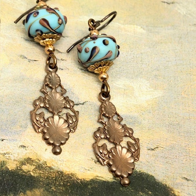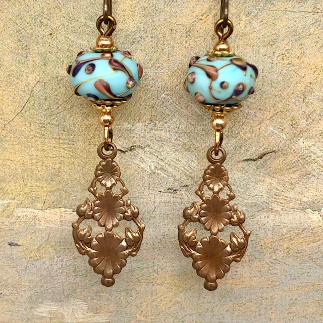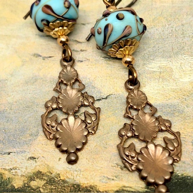 Ces longues boucles d’oreilles asymétriques sont composées de superbes perles en verre filé à la flamme bleu turquoise et bronze mat. Elles sont flanquées de coupelles et de petites perles rondes en laiton doré. Au-dessous de ces perles artisanales j’ai suspendu de très beaux pendentifs en forme de goutte avec un motif floral en laiton brun foncé.