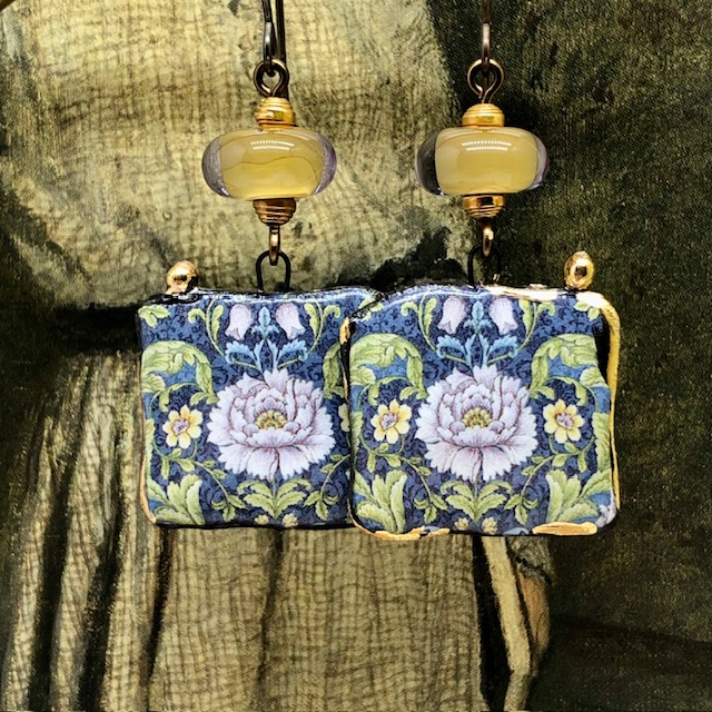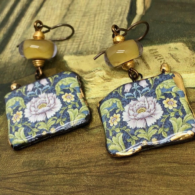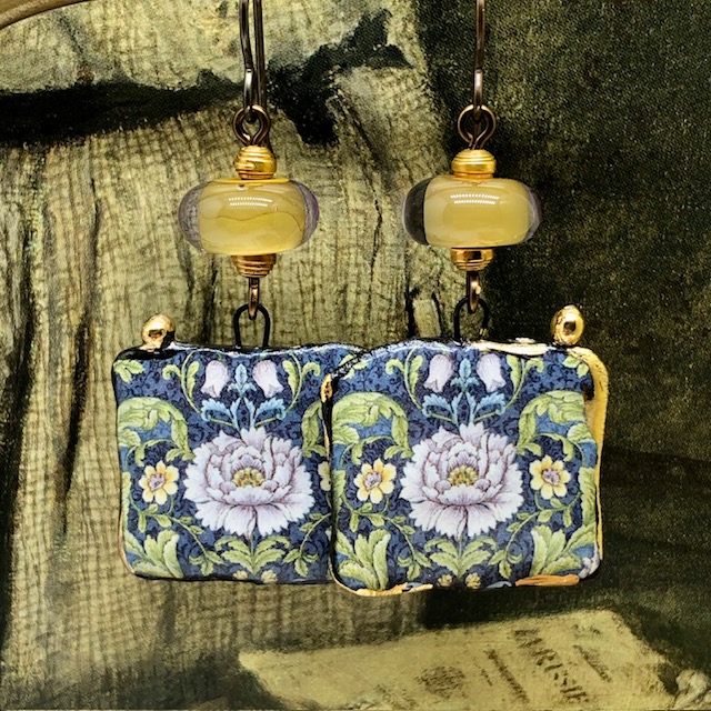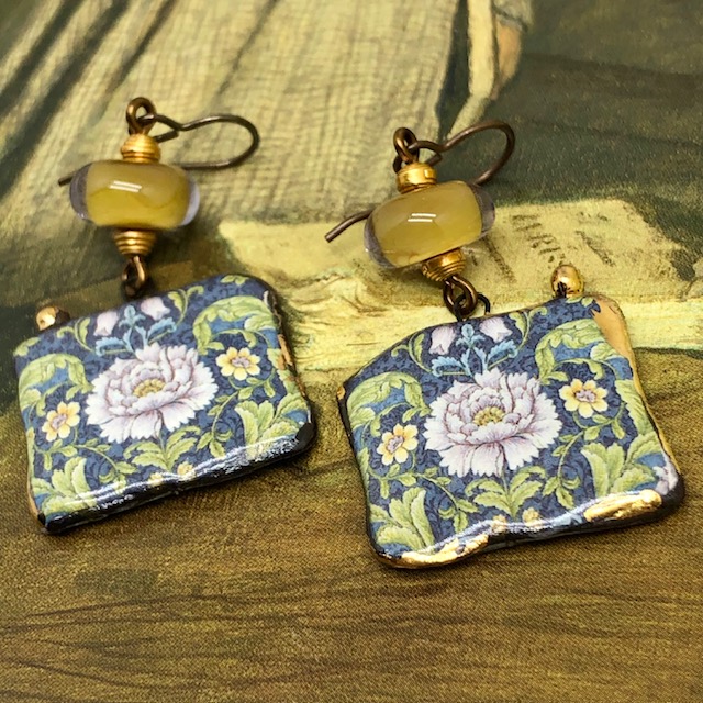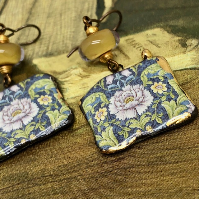 Ces boucles d’oreilles asymétriques sont composées de ravissants pendentifs en céramique qui reprennent un motif floral de William Morris (1834-1896), des chrysanthèmes blancs sur un fond bleu foncé.