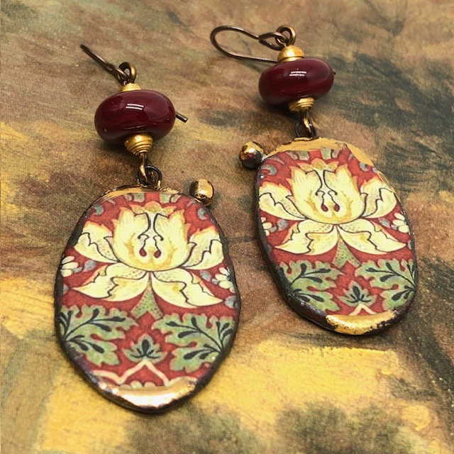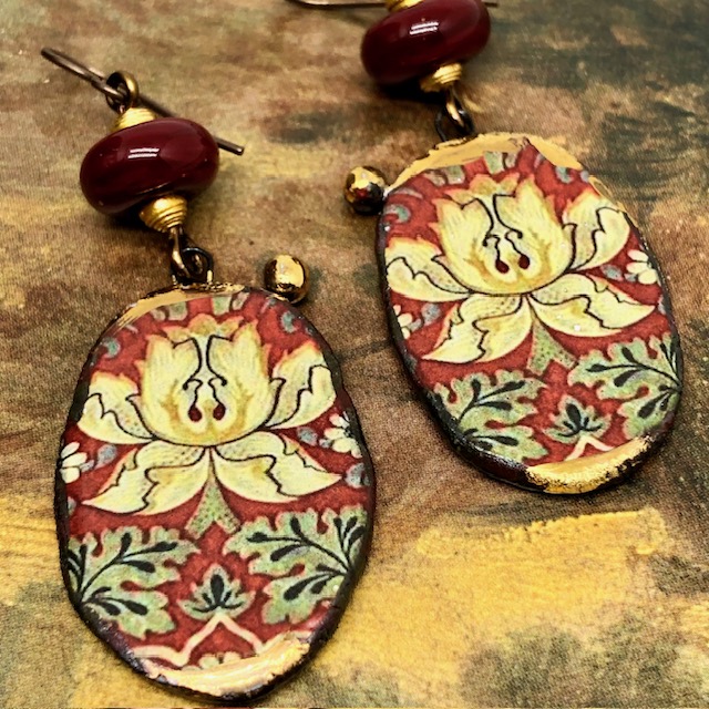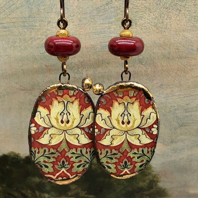 Ces longues boucles d’oreilles asymétriques sont composées de ravissants pendentifs en céramique qui reprennent un motif floral de William Morris (1834-1896), connu sous le nom de « The Pimpernel » (le mouron). Ce motif existe avec des variations au niveau des couleurs, il est ici repris sur un fond rouge cardinal.