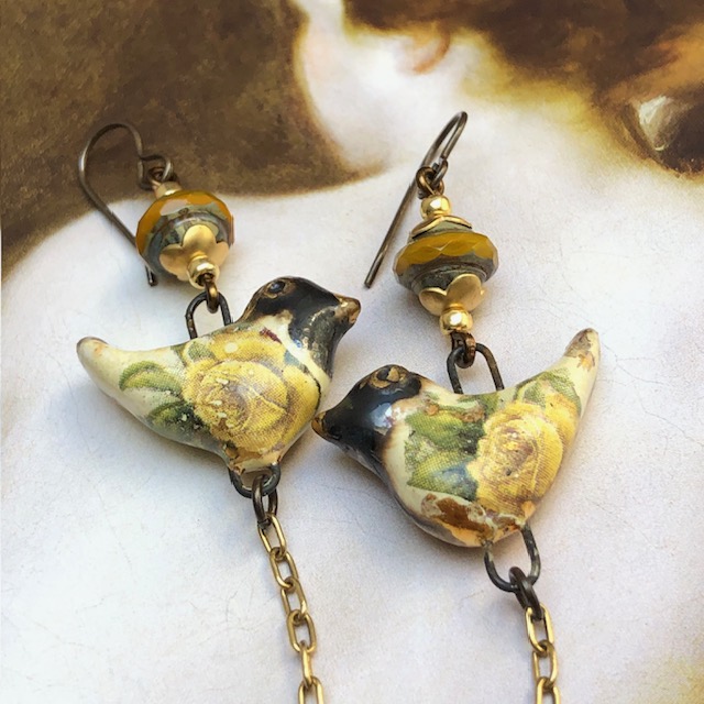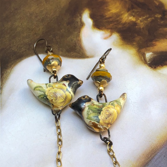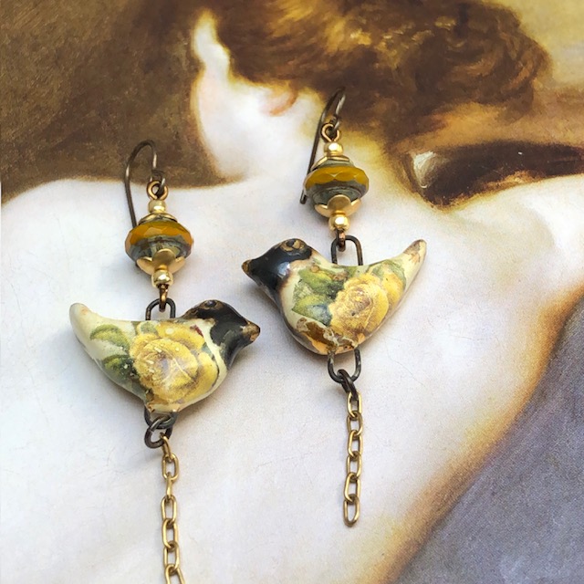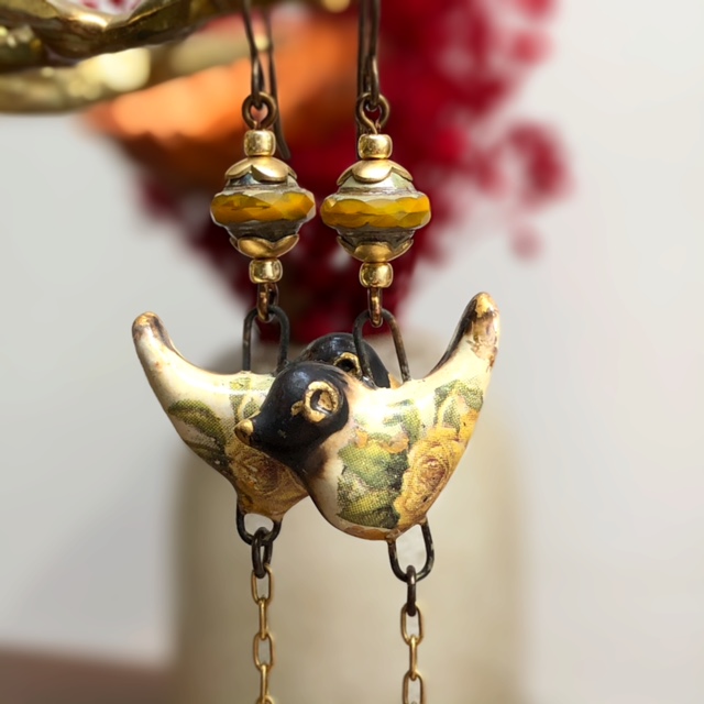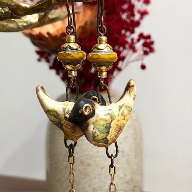 Ces boucles d’oreilles sont composées de magnifiques pendentifs en céramique représentant un oiseau au plumage jaune et vert. Au-dessus de ces pendentifs artisanaux, j’ai ajouté de jolies perles facettées en verre de Bohême jaune safran, flanquées de coupelles en laiton doré. Des perles de rocaille japonaises or et des chaînettes en plaqué or terminent cette composition.