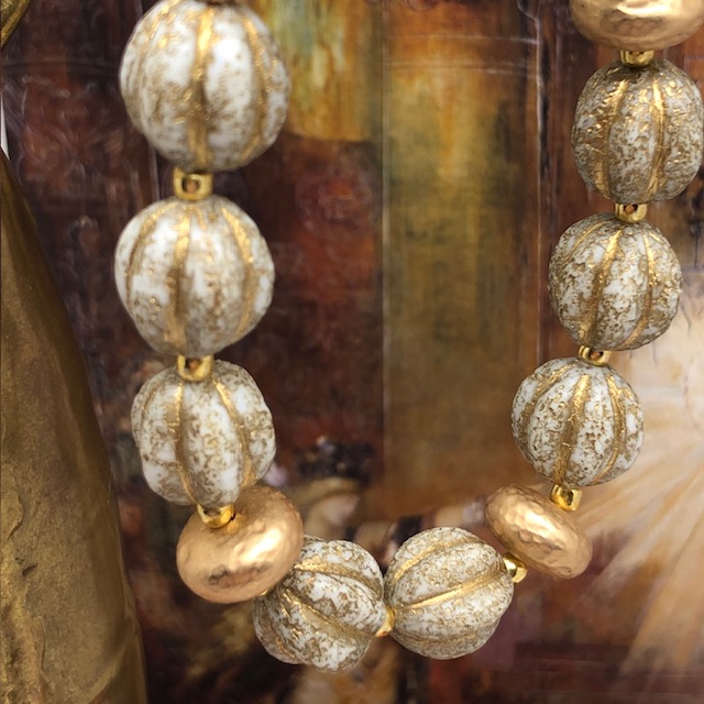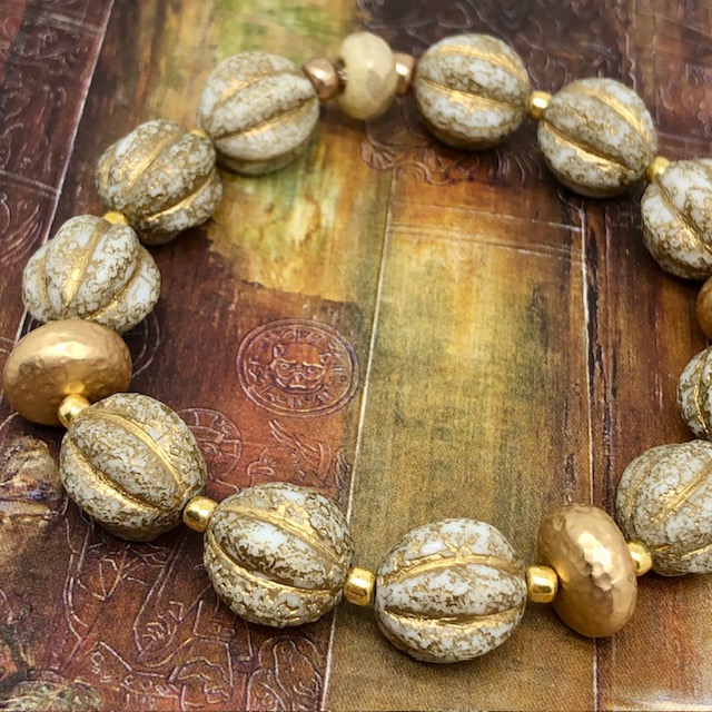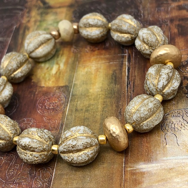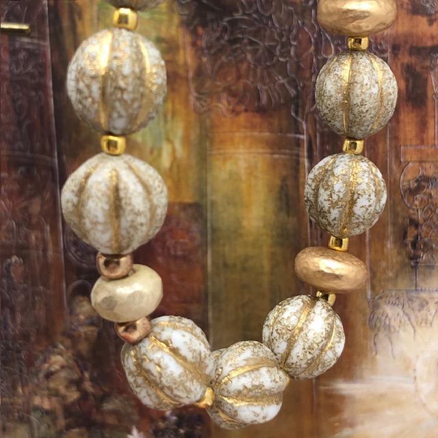 Ce bracelet est composé de perles en verre de Bohême en forme de melon beige avec des stries de couleur or. Je leur ai associé de superbes perles en laiton doré de forme aplatie avec un aspect martelé. La perle centrale du bracelet est beige doré. J’aime le contraste des couleurs et des textures. Ces superbes perles sont séparées par de petites perles de rocaille japonaises dorées.