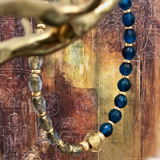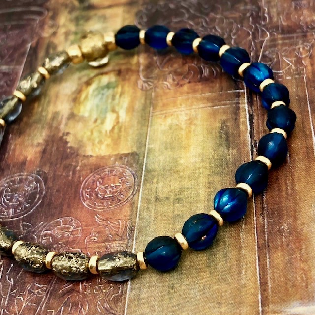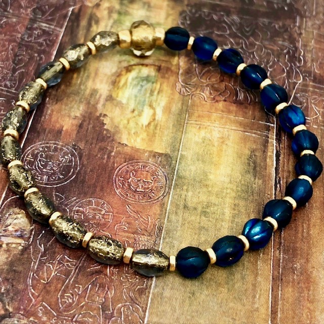 Ce bracelet est composé de perles en verre de Bohême de diverses formes et couleurs. Les premières ont une forme ovale; elles sont bleu foncé, transparentes avec des reflets or et elles ont un aspect rustique. Les secondes perles ont une forme de melon et elles sont d’un bleu nuit profond. La perle centrale du bracelet est transparente et or. J’aime le contraste des couleurs et des textures. Ces superbes perles sont séparées par de petites perles de rocaille japonaises dorées.