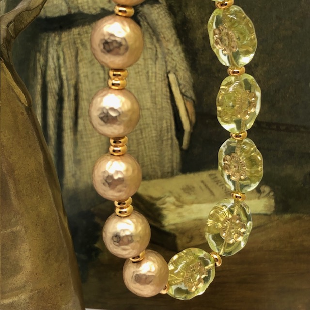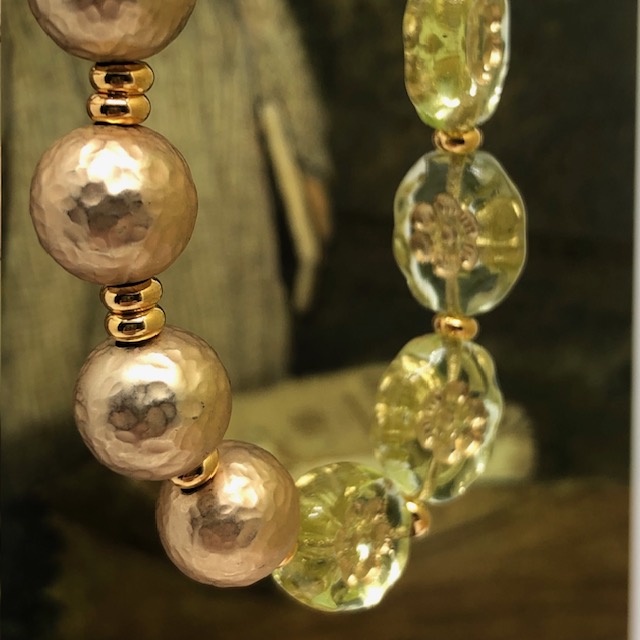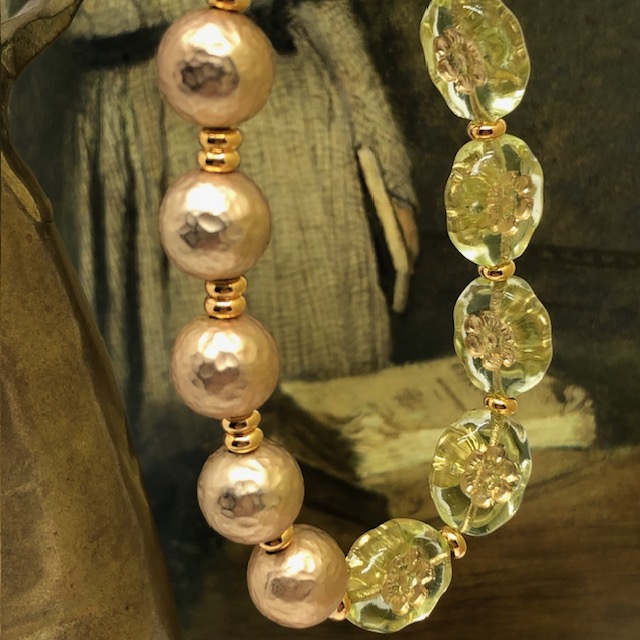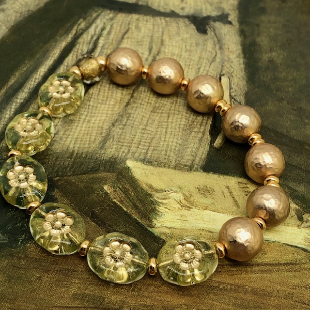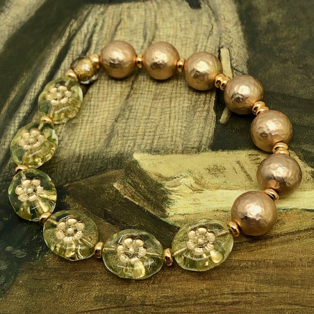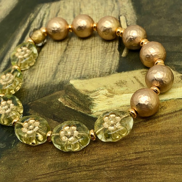 Ce bracelet est composé de magnifiques perles en verre de Bohême ovales vert anis avec une fleur incrustée dorée. Je leur ai associé de superbes perles rondes martelées en laiton plaqué d’un bel or mat. La perle centrale est en verre de Bohême bronze et or. Ces superbes perles sont séparées par de petites perles en métal plaqué or.